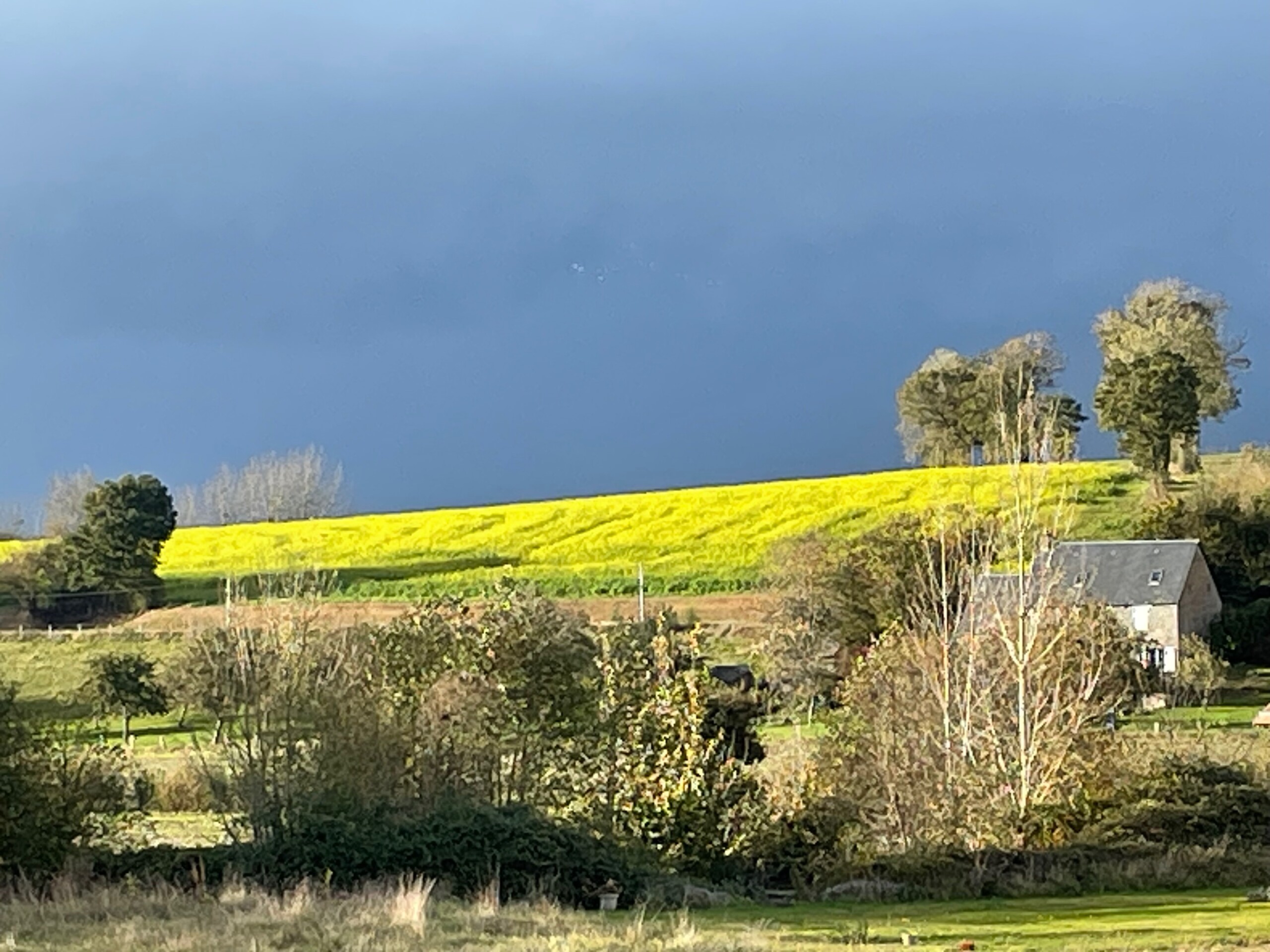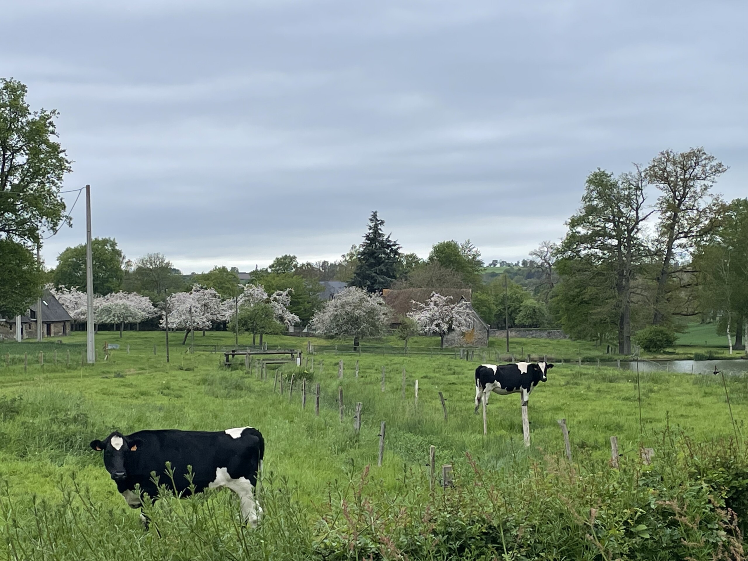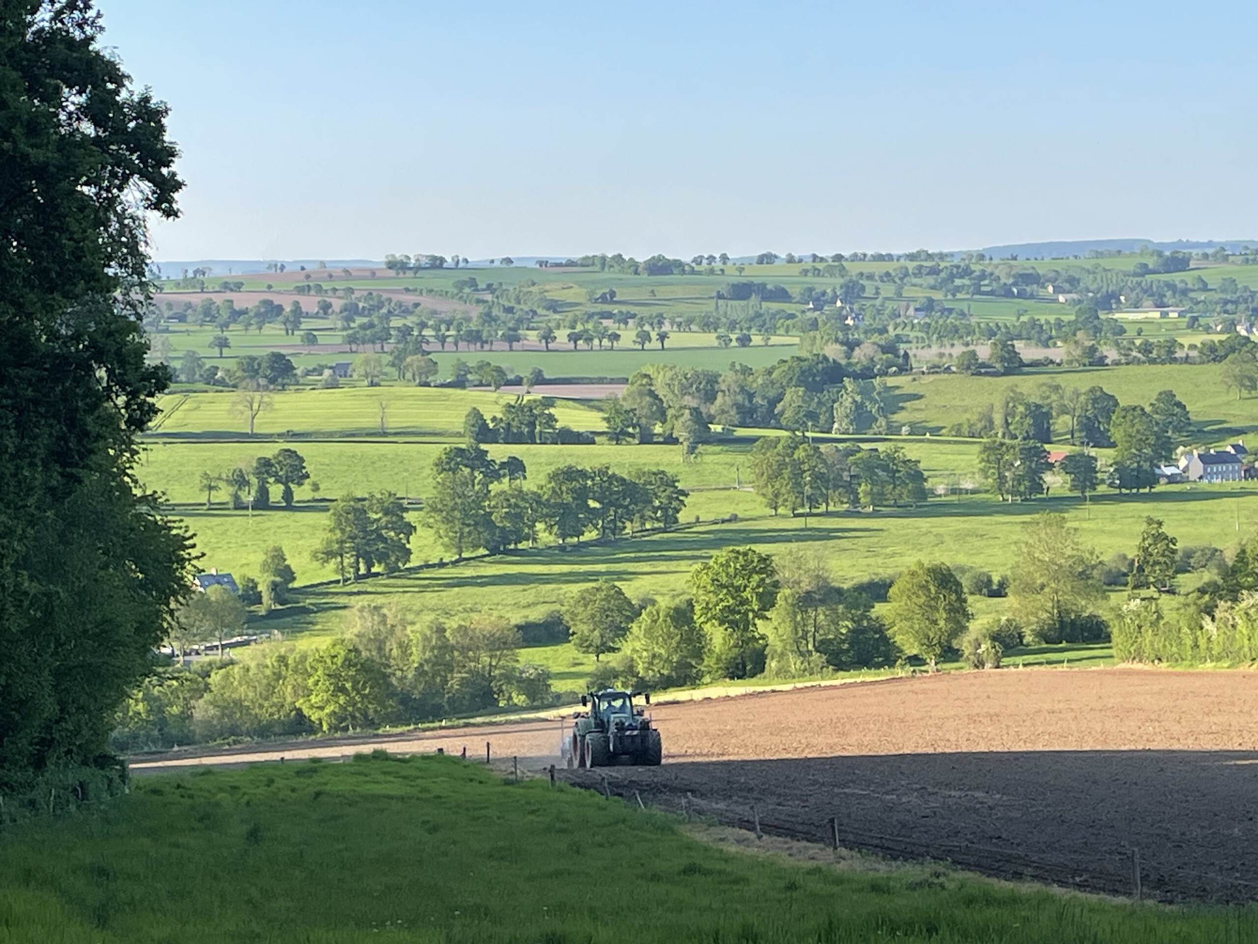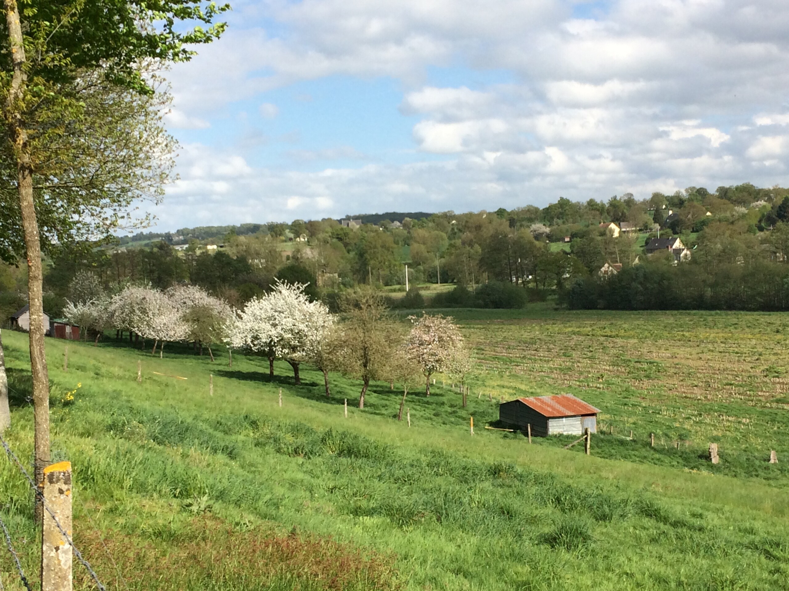 Views are like faces I have gotten to know over the years. Living in the region of the Normandie Bocage, hedged farmland or mixed woodland and pasture, since 2008, I have walked past the same places and the same scenes so many times that they’ve become as familiar as neighbors. Walking my son to up the hill to the village school, we’ve stood hand in hand and looked at the pasture which lies at the crest of the bend in this road. We’ve seen it in winter, in spring, in summer, and in autumn, and observed how its features change according to the seasons. In the warmer months, its crumbly, chocolate colored earth lies furrowed and planted. There is a period of a day or two, when the field is being prepared for planting, when it is pungent with the odor of cow manure. In due time, lines of green sprouts perk up, becoming rustling ears of maize. And then, after the autumn harvest, the field is a rough textured crosshatching reminiscent of brushstrokes from a Van Gogh painting.